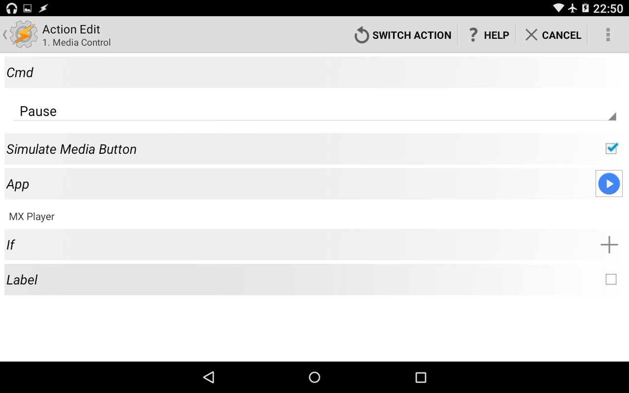 Cmdを「Pause」にしてAppでMXプレイヤーを選択。初期画面に戻り設定終了です。これで、キーOFFで充電されない状態になった場合MXプレイヤーは一時停止になり、再生中のスリープ無効が解除されてスリープに入るようになります。