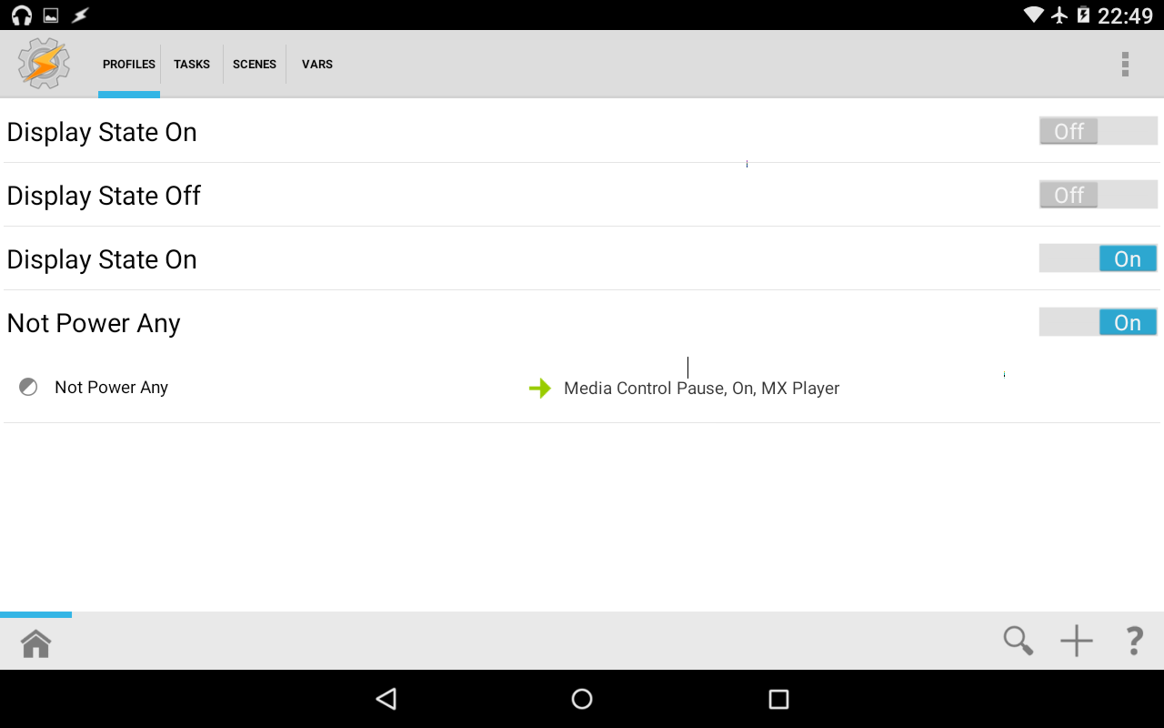 Not Power Anyは再生中スリープ無効になるプレイヤーで有効ですので、Playミュージックアプリで説明したDisplay State ON/OFFをPower Any(起動時のフラグ)Not Power Any(終了時のフラグ)及び置き換えても良いかと思います。