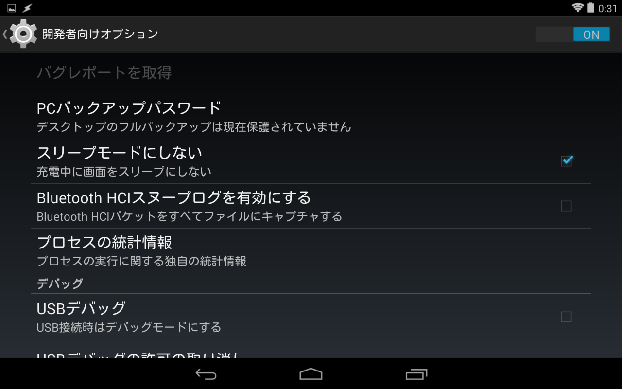 6.USBから電力供給を受けている際はスリープしない設定(開発者向け設定)なので画面は表示したままに