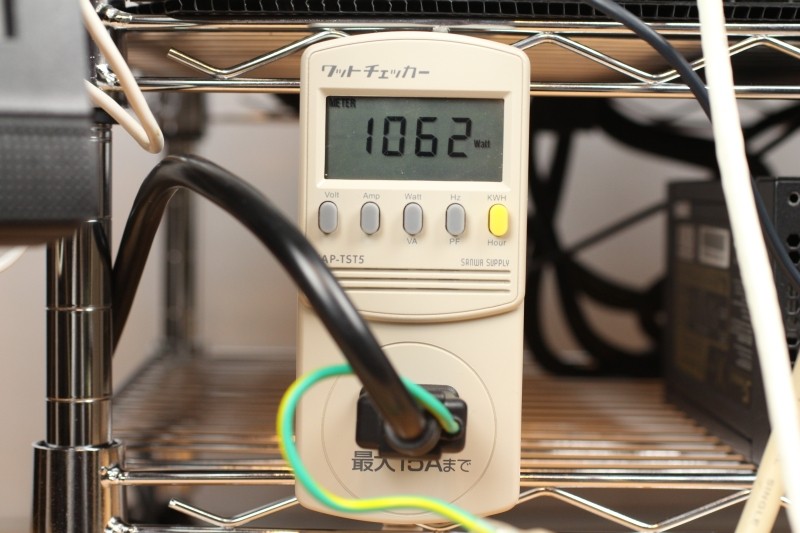 試しに消費電力をエコワットで計測してみましたが採掘中1062W(ピークで1090W)の電力を消費していました。