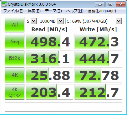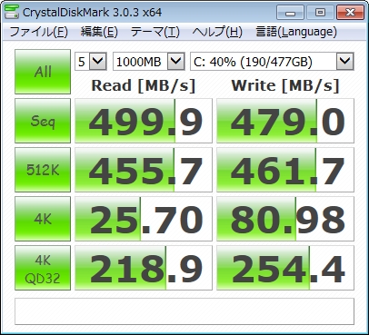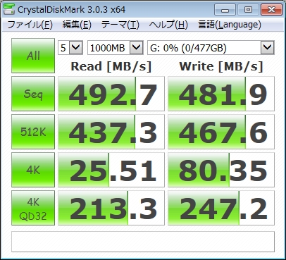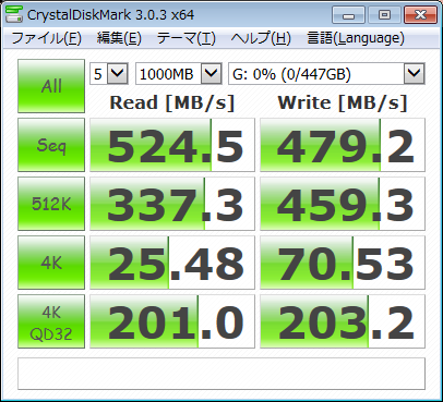 実際にベンチマークをしてみましたが、古いPCのためシーケンシャルリード550MB/s・シーケンシャルライト500MB/sと、仕様通りの性能は出ていないものの、それに近い数値が出ています。