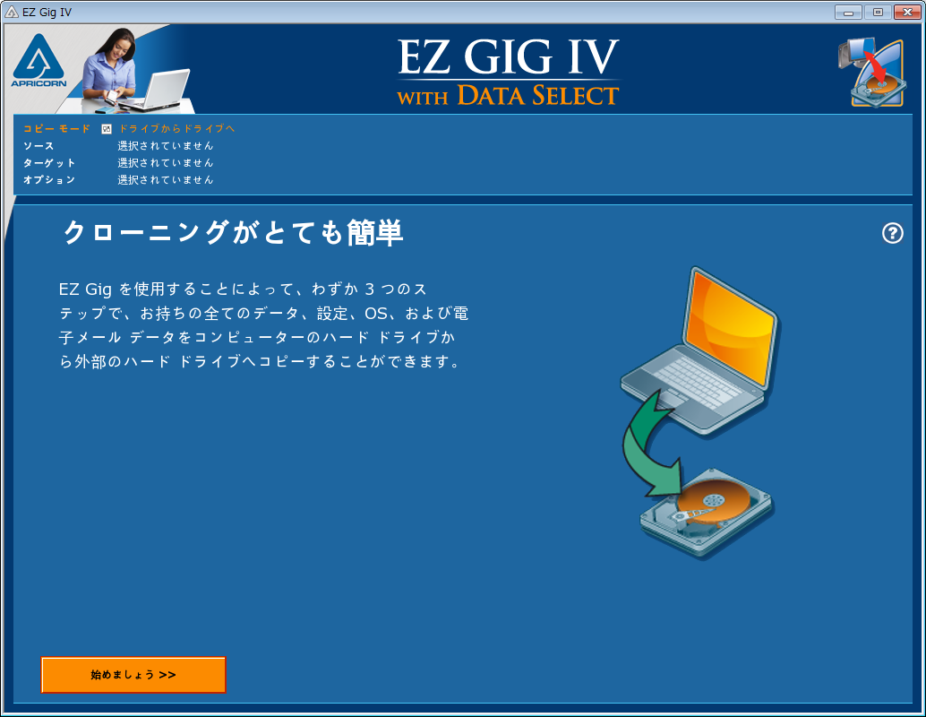 ※ApricornのEZ GIG IVを起動する前に、コピー元のディスクとコピー先のディスクを接続した状態でPCを立ち上げておくこと。