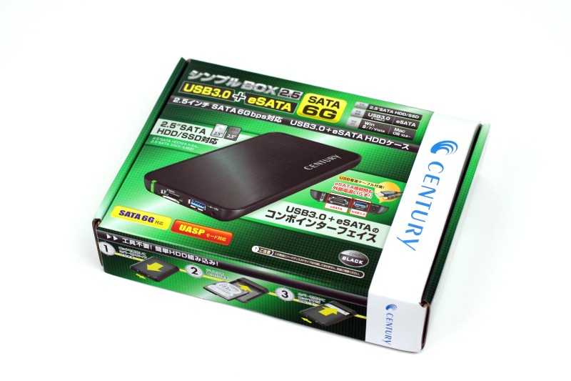 高速のSSDを外付けストレージにするのだから速度はできるだけ欲しいということで、最近普及も進んできたUSB3.0とあって損はないeSATAに対応したセンチュリー シンプルBOX2.5 USB3.0+eSATAを入手してきました。