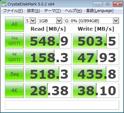 仕様上は僅かにSDSSDHII-960G-J25が上のはずなのですが、古いPCではそれほど差が出ないのかもしれません。とはいえ、SSDとしての速度は実用十分です。