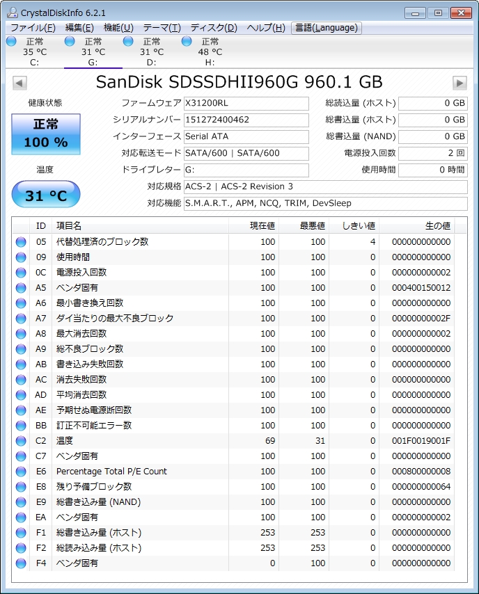 早速PCにつないでCrystalDiskInfoで確認をしてみました。SSDで960GBという数値に、思わずここまで来たかと感じるものがあります。
