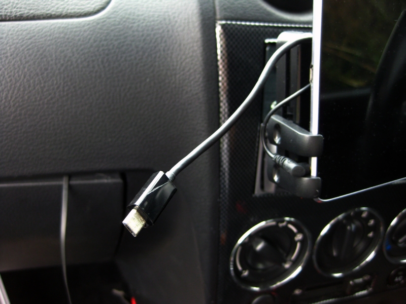 安定した電源供給ができず、バッテリーの消耗が早く底をついたため、代替ケーブルで充電していたのですが、グローブボックスからケーブルが伸びるという状態は見た目を台無しにしていました。