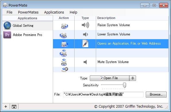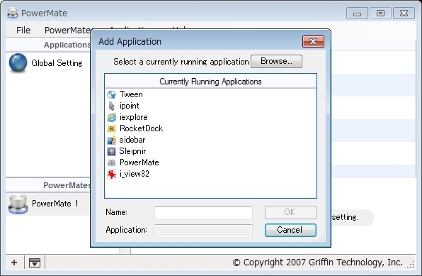 アプリごとの設定については対象とするアプリを起動後、PowerMate Managerで対象とするアプリを選択します(もしくはアプリを指定)。