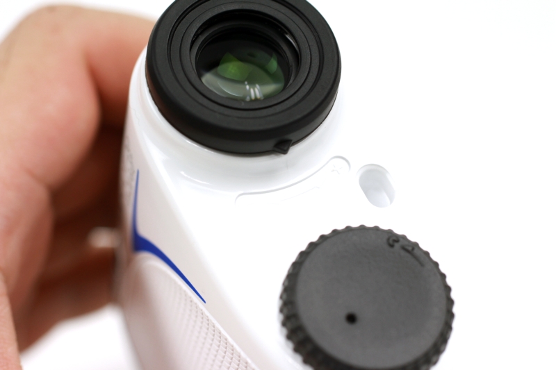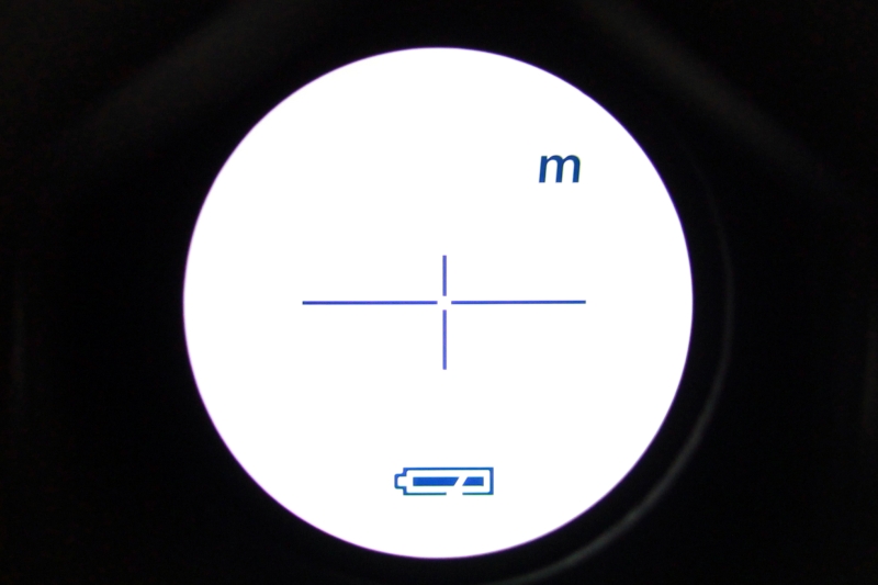 COOLSHOT 20自体の機能はレーザーによる距離計測のみのため、ファインダーは目標を定めるためのクロスと距離単位、バッテリーの残量表示のみとシンプルです。