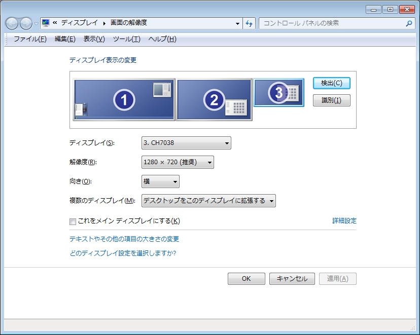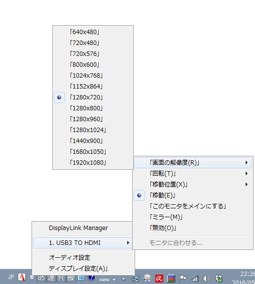 画面の解像度(デスクトップで右クリック呼び出し)を表示し、新しくCable Matters USB 3.0 → HDMI/DVI 変換アダプタに接続したモニターを「複数のディスプレイ」を変更してアクティブにします。