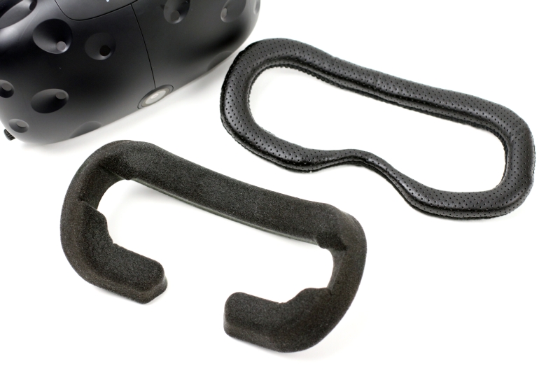 VIVEのフェイスクッションと並べてみました。キンガ 3Dメガネ VR ゴーグル VR BOXのフェイスクッションは合皮レザーのような表面で、厚みも幅も薄いため少し頼りなさを感じます。