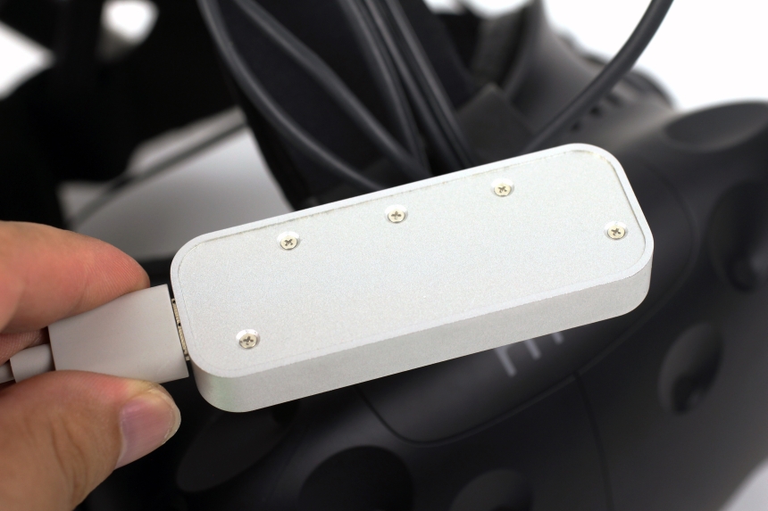 VRのサードパーティー製周辺機器といえば有名なものにLeap Motionがあります。Leap Motion はVRのHMDにマウントし、手の動きのVR内に反映させる用途に使われていますが、PC本体からUSBのケーブルを延長して取付けると非常に邪魔になるので考え物です。