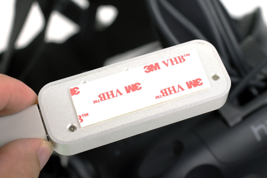VIVEのHMDは湾曲しているため両面テープの長さはさほど必要なかったのですが、強力な両面テープを使用したため、僅かな接着面積でもLeap Motionはしっかりと固定されています。激しく頭を振るようなVRゲームをプレイしても張り付いたままです。