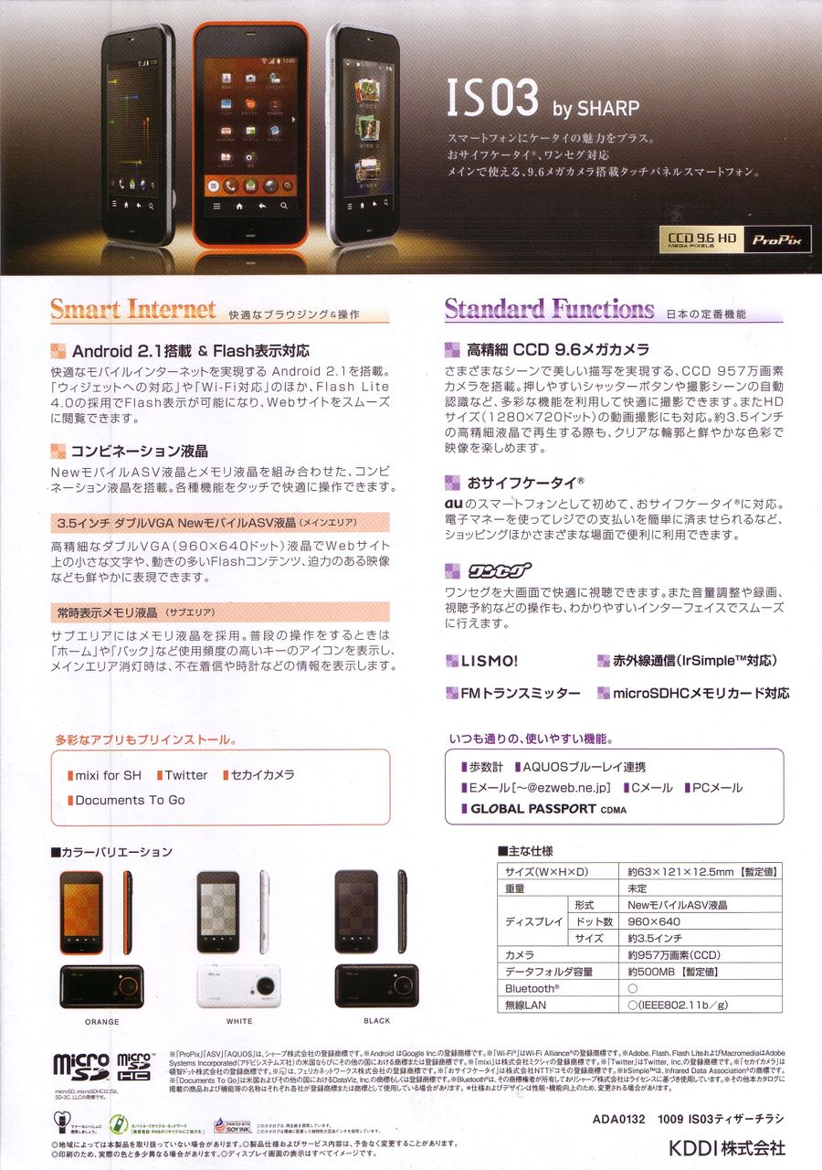 しかしながら日本の携帯電話と違いスマートフォンの企画・製造は海外のメーカーが殆どでその機能に日本特有の機能は含まれていませんでした、今回のIS03は今までにないおサイフケータイ・ワンセグ等のガラパゴス機能を搭載したスマートフォンということで従来のスマートフォンとは一線を画したスマートフォンとなっています。