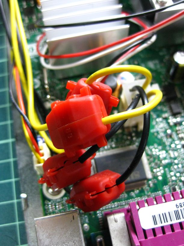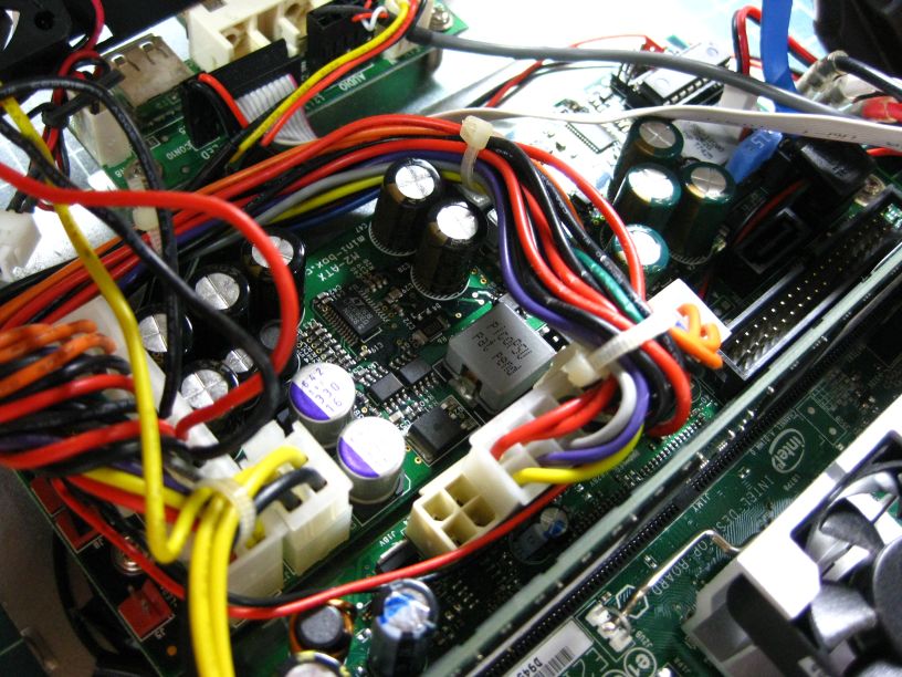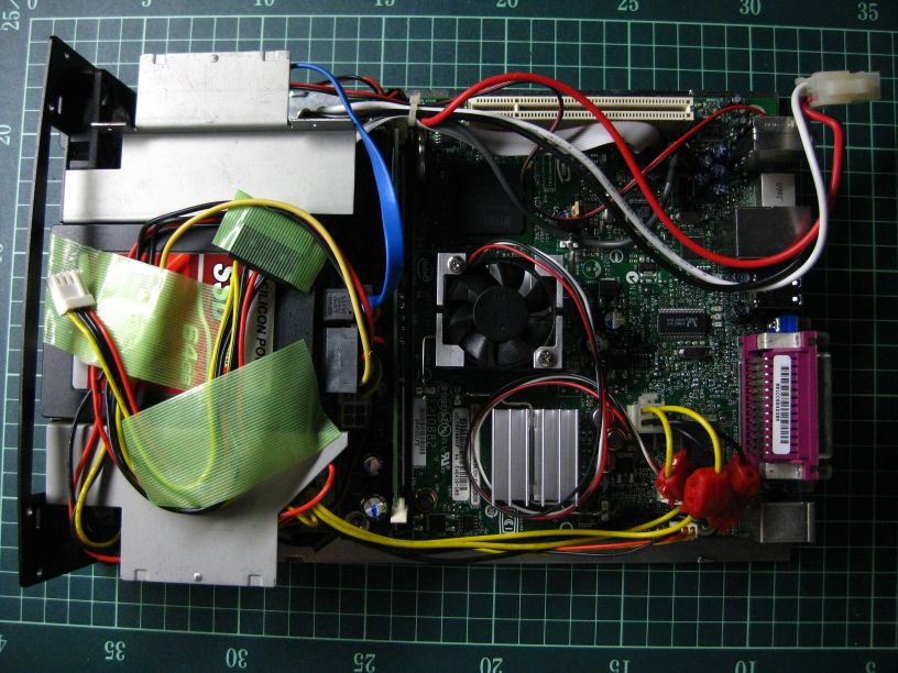 中身はこの通りぐちゃぐちゃです、なにぶん狭いケースなのでかなり詰め込んだ設計となっています、困ったことにSSDを留めてあるプレートにMBの電源コネクタが干渉しているのでハンマーでプレートを叩いて加工しています、そのためSSDは外側のねじ2カ所のみしか留めていません。