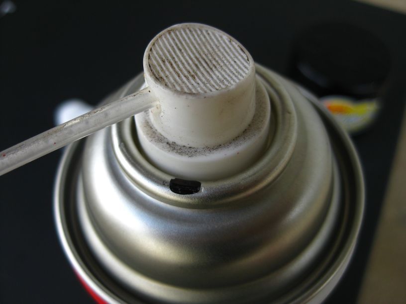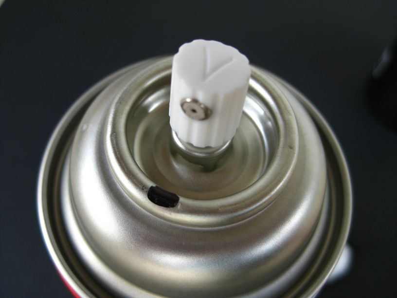 缶は立てて使う、ノズルの先端で布テープに穴を開ける、後は噴射あるのみ。