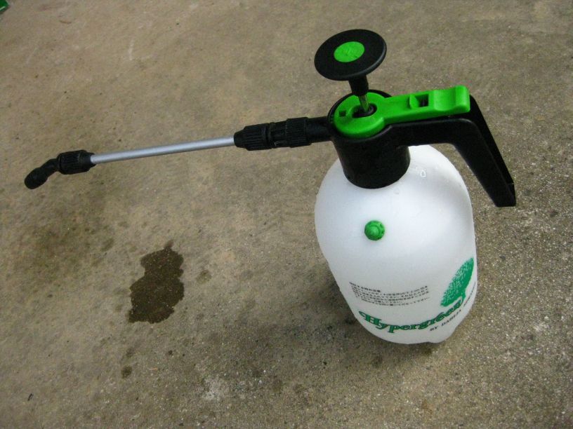 エンジンクリーナーはプラスチックは使用注意となっている、付着した場合水で洗い流すようにとのこと、ここで家庭菜園などで使われる薬剤スプレーを使ってくまなく水洗いする。