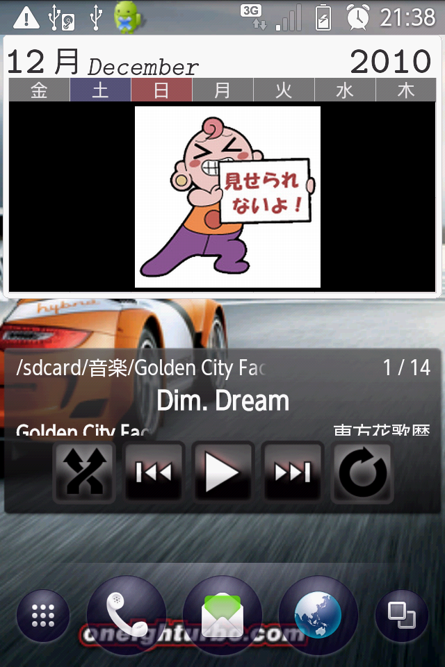携帯電話のフラッシュ待ち受けはありませんがそれに相当するライブ壁紙があります、これはAndroid 2.1より搭載された機能で今はそれほど数はありませんが今後多数のライブ壁紙が出てくるものと思っています、プリセットでいくつか入っていますが動きがある分バッテリーが少し心配です、しかしタッチに対応した動きがあってこれはこれで面白いです、紅葉が水面に浮かんでいるライブ壁紙なんか風情があっていいですよ。