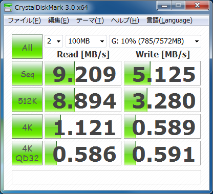 付属のSDカードはアンドロイドにマウントして使うと遅くWindows7では毎秒2MBの転送速度と表示されていました、ちょっと遅いなと思い試しにベンチマークをして他のmicroSDと比較をしてみました。