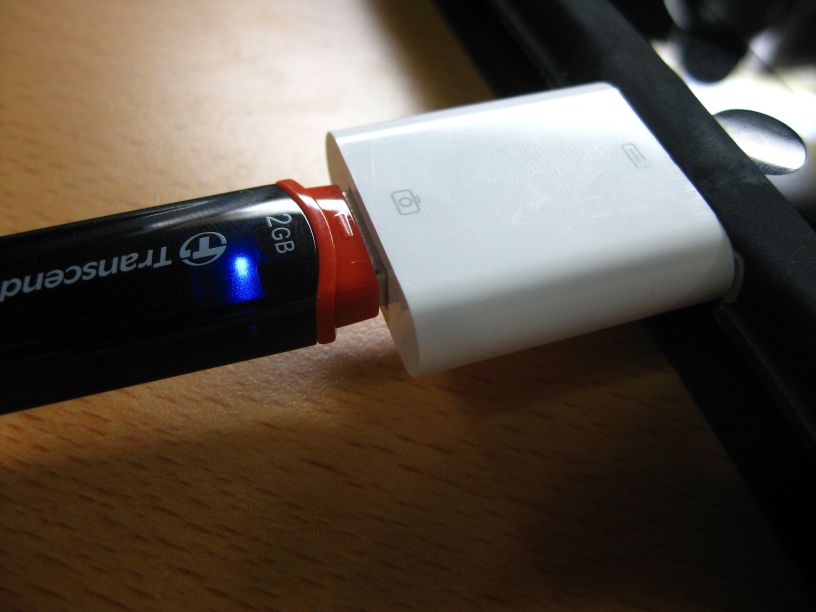 USBコネクタがあるとついやっちゃうんだ!ということでUSBメモリをブスリ!iPadがなにやら英語でエラーメッセージを吐いてる、こんな非対応デバイスを挿すなんて絶対に許さないよと読み取れる。