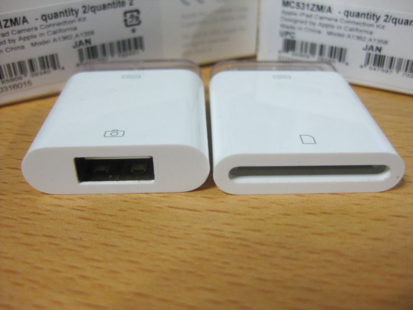 iPad CCKは二つのアダプターがセットになっている、USBコネクタとSDカードコネクタの2種類。