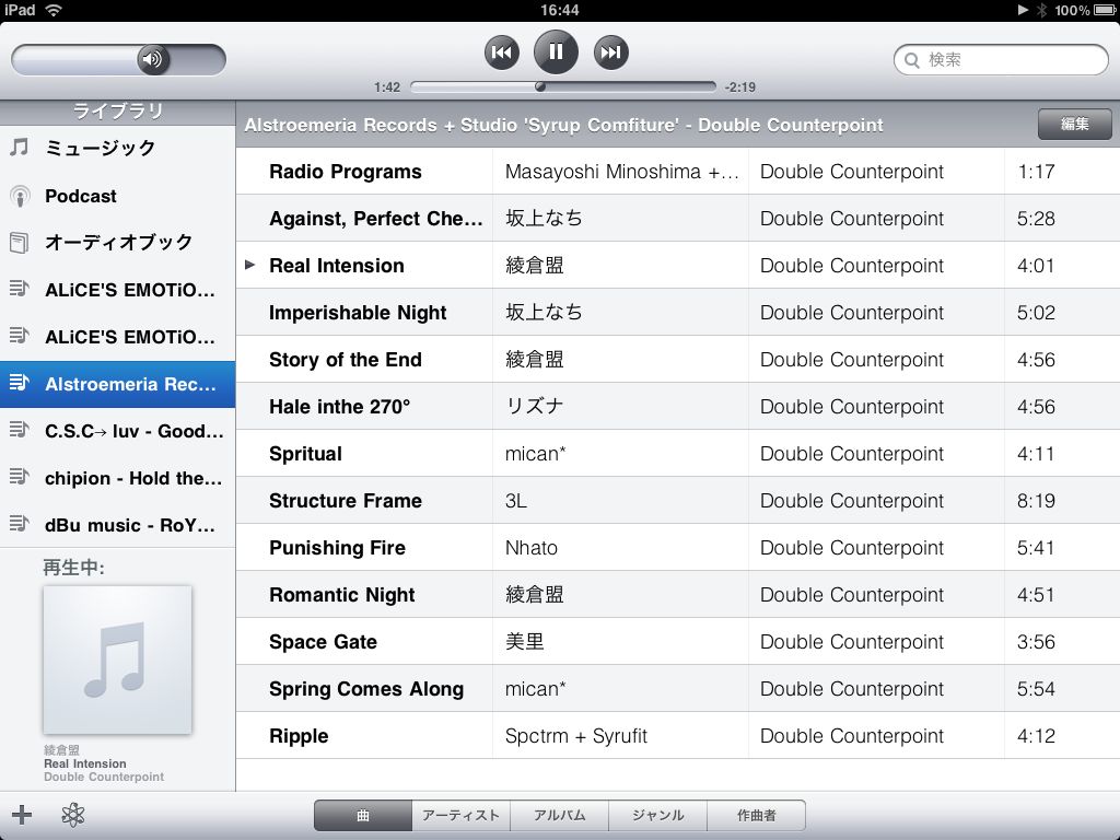 見た目に変化は無いがきちんと音はHAMU02から出力されている、他のレビューを見たところボリュームを操作をデバイス側で行うようになり画面左上のボリュームスライド部分が操作付加になりデバイス名が表示される模様、HAMU02はiPadで操作が可能となっている。(しかし濃いプレイリストだw)
