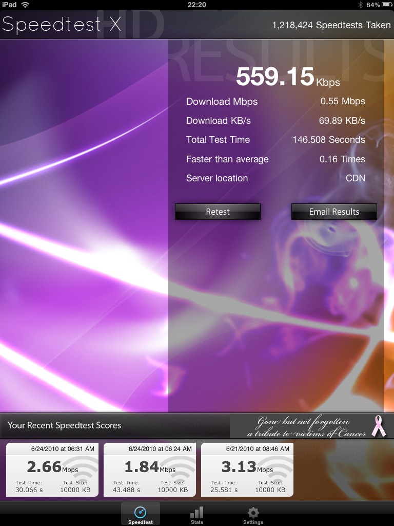 アンテナ3本状態でスピードテストを実施、クティオはマルチポートに対応していない、車載時はUSB2-PCADPKでUSBモデムとして使用していたのでマルチポート無しでの比較となるが、USB2-PCADPKでは40KB/s程度、お仕置きタイム(auの速度制限)になると7KB/sまでに落ち込んだがクティオで使用する方が早く70KB/sというスピードをたたき出している、流石に画像下部のような無線LANのスピードとは比べものにならないがバッテリー搭載で持ち運んで使えるのはクティオの強みだ。